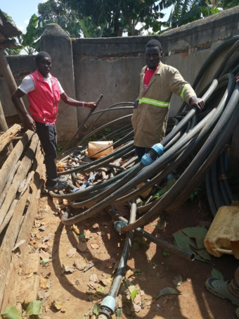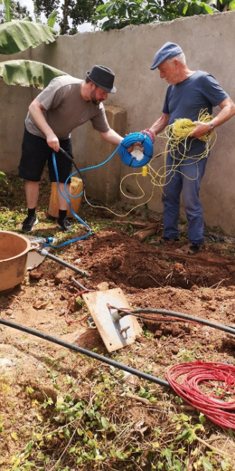 Weil für eine Pumpe, die hierzulande ca. 400 Euro kosten würde, vor Ort ein Angebot über 4.000 Euro vorlag, entschlossen sich Thomas und Johannes Langsch im Juni mit einer Pumpe nach Uganda zu fliegen und die Gesamtsituation zu begutachten. Zusammen mit Fachkräften aus dem Projekt sowie dem verantwortlichen Elektriker und Solarteur vor Ort konnte diese installiert werden. Nach einem Probelauf musste allerdings festgestellt werden, dass die Leitungen zum Haus an mehreren Stellen defekt waren, weil diese durch Pflanzungen daneben durchgehackt waren.
